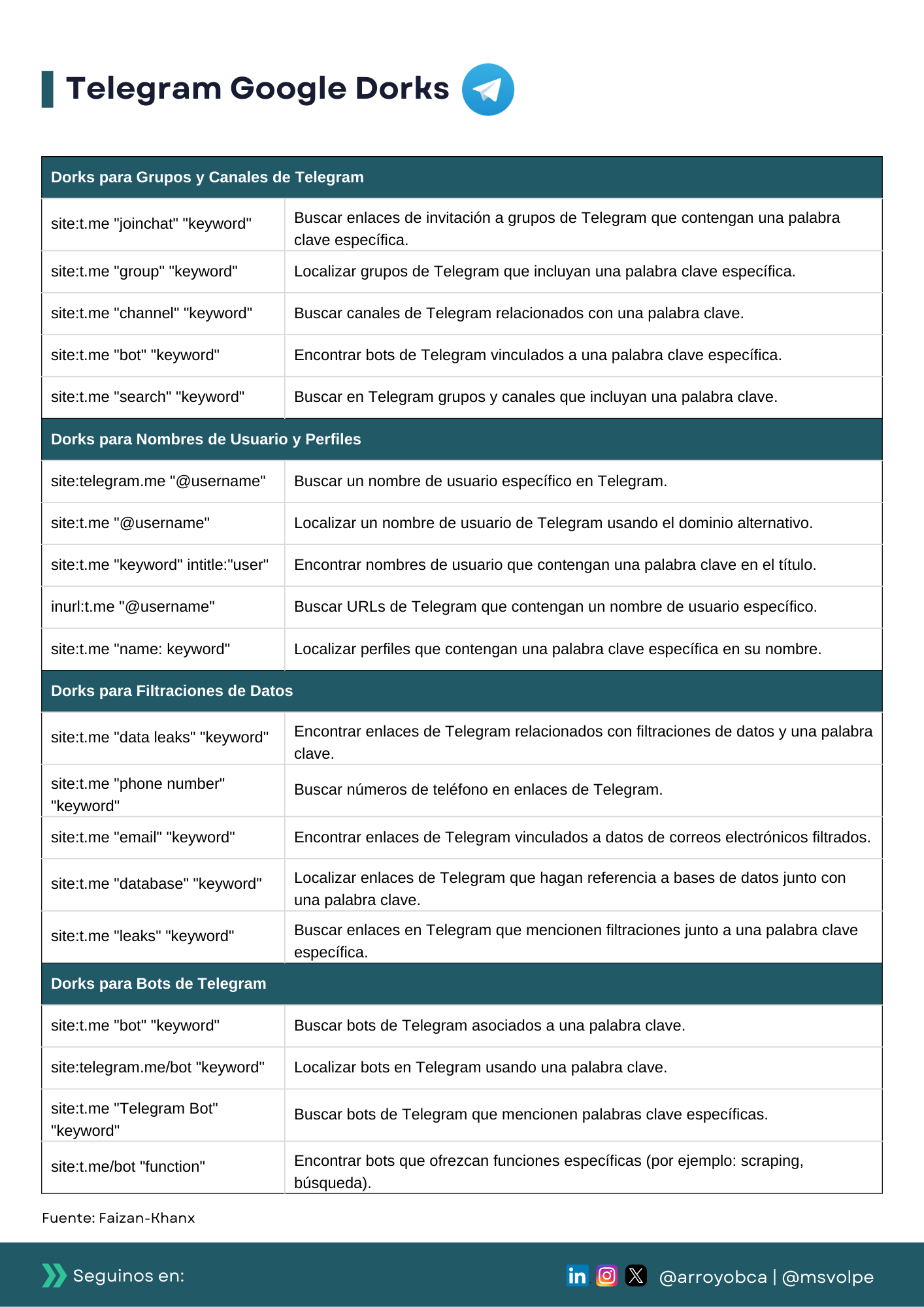 | site:telegram.me "@username" | Buscar un nombre de usuario específico en Telegram. |