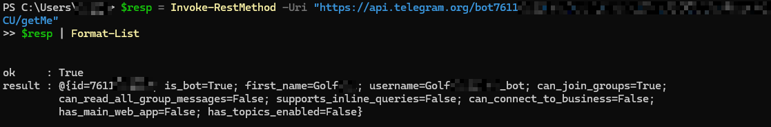 $resp = Invoke-RestMethod -Uri "https://api.telegram.org/bot<TOKEN>/getMe"